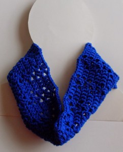 This crochet cowl is simple, but the pretty lace design makes it suitable for any occasion. The finished size measures 5″ by 13″ long. It’s the perfect size for wearing with or without a coat.