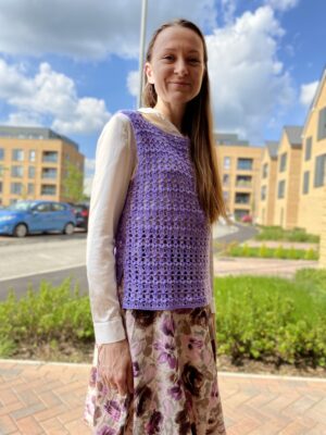 This crochet lace top is your everyday luxury that can be paired with a simple tank top or a silk shirt depending on the occasion. The tee is worked flat from bottom up in two pieces and sewn together using the Locking Mattress Stitch. This project may be an easy start with making your own handmade wardrobe. And once you start, you will not want to stop! The crochet lace top is the perfect option for warm spring and summer days due to its lacy structure. It has got gentle shaping around armholes and neckline to give it more fitted look.